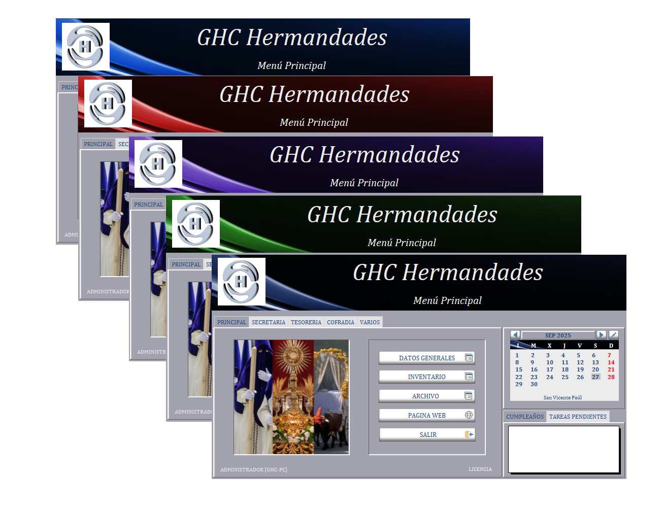 Nuestras licencias se adaptan perfectamente a cualquier tipo de corporación y presupuesto, ya sean hermandades de penitencia, gloria o romería. También tenemos versiones especiales para consejos de hermandades, bandas, capataces, museos y asociaciones.