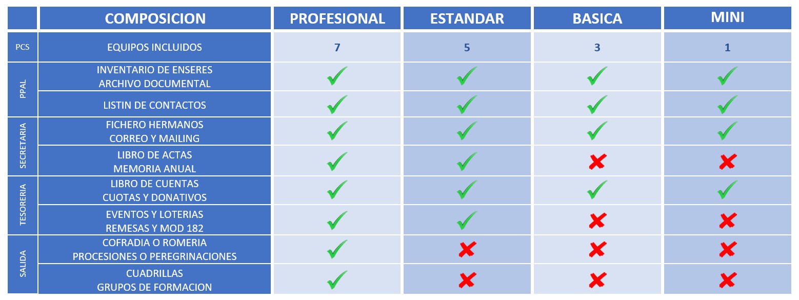 Para Hermandades de gran tamaño, contabilidad compleja y que desean también gestionar la cofradía o romería desde nuestro programa. Incluye todas las secciones de secretaría, tesorería y la cofradía o romería. Se puede instalar hasta en siete equipos informáticos.